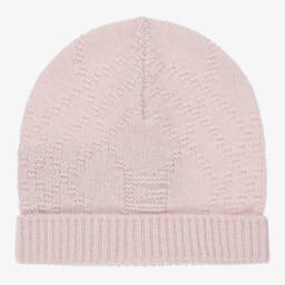 Light pink and ivory hat for baby girls by Gucci, patterned with the luxury brand's GG logo. Gorgeously soft, it is knitted from fine wool with a pale pink trim.