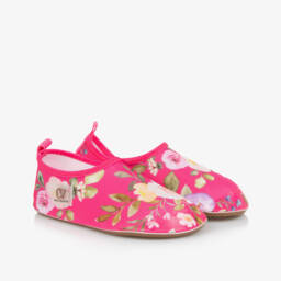 Girls pink beach shoes by Playshoes, made in soft, flexible mesh. The fronts have a cute mermaid print and a velcro strap fastening. With a slip-resistant rubber sole, these aqua shoes are comfortable for wearing on the beach or in and around the swimming pool.