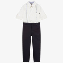 The boys blue knitted trousers set by Pretty Originals combines comfort and style for spring and summer wear. Crafted from soft cotton, the top features blue and white stripes with ribbed trims, short sleeves, and a charming button detail. The back popper fastening ensures easy dressing. Paired with matching trousers featuring a comfortable elasticated waistband, this set is perfect for playful days. Limited quantities available, so seize this opportunity to add a touch of elegance to a little one's wardrobe.