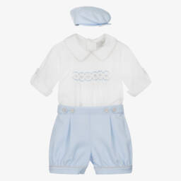 The boys navy blue smocked buster suit by Pretty Originals is a traditional white and navy blue shorts set made from a soft cotton blend. The top features beautiful hand-smocking and hand-embroidery, with gingham piping on the collar and cuffs. Button fastenings on the back and larger buttons attaching to the shorts ensure a neat look. The navy blue bubble shorts have inverted pleats and an elasticated waistband and cuffs for a comfortable fit. Limited quantities available.