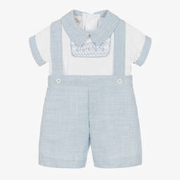 Boys navy blue smocked shorts set by Pretty Originals showcases a charming traditional look. The set includes a white cotton-blend shirt with a hand-smocked and hand-embroidered bib, complemented by a navy linen-look collar and turned-up cuffs. The shorts feature adjustable cross-over straps with button fastenings, ensuring a snug fit. Perfect for spring and summer, this outfit is a last chance to buy with limited quantities available.