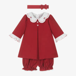 Lovely navy blue dress set for little girls by British brand Pretty Originals. This traditional, soft and mid-weight dress has sweet puffed sleeves and pretty hand-embroidered flowers at the neckline. It is trimmed with white piping and delicate lace, with attached ribbon bows. Fully lined for comfort, it fastens on the back and cuffs with buttons. The dress comes with matching knickers that have a gently elasticated back and fasten with side buttons. There is a pretty ribbon bow clip to complete the look.