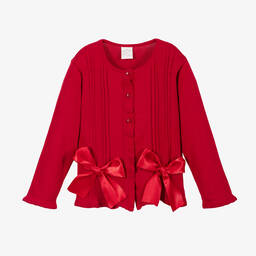 Girls beautiful pink cardigan by Pretty Originals, knitted in soft and lightweight cotton. It is decorated with statement ivory satin bows and easily fastens with buttons on the front.