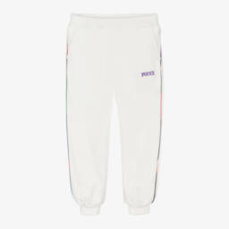 These black joggers for girls by PUCCI feature a signature Onde pattern, bringing a touch of Italian flair to any outfit. Crafted from soft, mid-weight cotton jersey, they offer comfort with an elasticated waist and ribbed cuffs. The colourful Onde print decorates the sides and back pocket, complemented by a pink embroidered logo. Suitable for casual wear, these joggers are available in limited quantities, making it the last chance to buy.