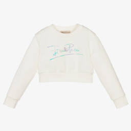 Girls ivory sweatshirt by PUCCI is crafted from soft organic cotton jersey, ensuring comfort and style. The bold logo appliqué with signature Iride curves adds a unique touch, inspired by the elliptical shape of the eye. Designed with ribbed trims and dropped shoulder seams, it offers a relaxed fit perfect for everyday wear. Ideal for spring and summer, this luxurious piece is available in limited quantities. Don't miss the last chance to buy this exclusive item, made in Europe.