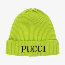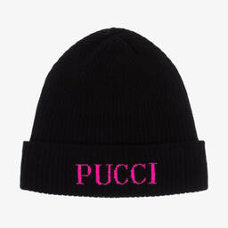A bright pink beanie hat for girls by luxury Italian brand PUCCI. Knitted in the softest wool and cashmere blend, this hat features the PUCCI logo in white for instant designer appeal. It comes with a drawstring bag for neat storage, printed with the signature fish motif.