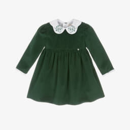 This sweet pink dress for little girls by Pureté du Bébé, is made in soft cotton twill. In a lovely Liberty-style floral print, it has a white rounded collar with delicate floral embroidery and pink scalloped trim. It fastens neatly on the back with buttons and is lined for comfort.