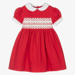 Pretty white and pink floral dress for baby girls by traditional brand, Rachel Riley. Woven in lightweight cotton, it has a intricate hand-smocked panel across the bodice and lovely puffed sleeves. There are simple button fastenings on the back and a sweet tie-up sash for a classic style. It comes with floral, elasticated knickers to complete the cute look.
