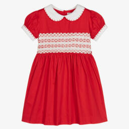 Girls navy blue cotton dress by British designer Rachel Riley. Beautifully hand-smocked and embroidered across the bodice, it has a white Peter Pan collar and cuffs, trimmed in blue for a traditional heritage look. Fully lined for comfort, it fastens at the back with buttons and has a sash that ties in a bow.