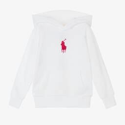 Navy blue hoodie for boys by Ralph Lauren, made in a mid-weight cotton jersey blend with a fleecy inside. Symbolic of the brand's identity, this layering piece is printed with the Polo Bear wearing blue jeans and an American flag sweater. It has comfortable ribbed trims and concealed side seam pockets to keep hands warm on colder days.