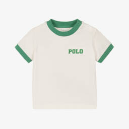 This navy blue short-sleeved T-shirt for little boys by Ralph Lauren features a charming "Polo" logo for an iconic touch. Made from soft cotton jersey, it has contrasting red trims and poppers on the shoulder for easy dressing.