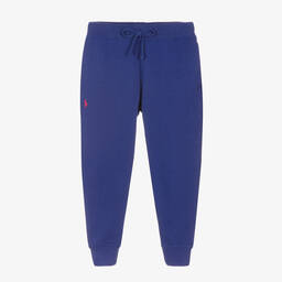 Mid-blue cotton joggers for girls by American designer Polo Ralph Lauren, with the brand's signature pony logo embroidered on one side in pink. Ideal for all-day wear, they are made in comfortable, lightweight jersey with a super soft, warm, fleecy inside. They have a bow on the ribbed waistband, ribbed cuffs to keep ankles cosy and useful concealed side pockets.