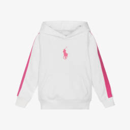 The girls white and pink hoodie by Ralph Lauren showcases elegant fuchsia pink trims and boasts a charming embroidered Big Pony logo. Crafted from a soft cotton-blend jersey, this hoodie offers a mid-weight feel, perfect for keeping cosy on cooler spring and summer days. The convenient pouch pocket adds a sporty touch, making it ideal for everyday wear. With limited quantities available, it's the last chance to buy this stylish and comfortable piece.