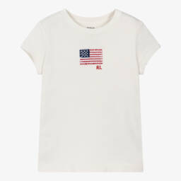 Teen girls ivory cotton T-shirt by Ralph Lauren, with a charming embroidered American flag and RL initials on the chest. The casual crew neck style is ideal for layering or wearing on its own for a relaxed look.