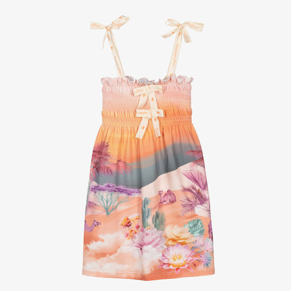 Girls pink cotton desert-print dress by RaspberryPlum is a charming addition to the collection. Featuring a soft cotton fabric with a vivid hot desert scene, it’s adorned with colourful trees, succulent plants, and friendly camels. The ivory ribbon shoulder straps are adjustable and can be tied into bows, complemented by a shirred bodice for extra comfort. Limited quantities available, so secure this delightful dress soon.
