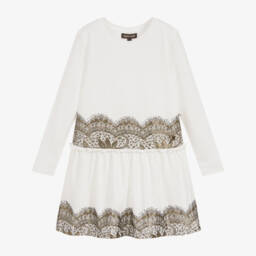 Girls ivory dress from Roberto Cavalli, with a pink and red 'undersea' print. Made in luxuriously soft silk, with a lightweight satin lining. The bodice is made of embroidered lace, with red beaded buttons to fasten.