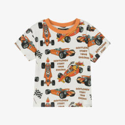 The boys ivory racing car T-shirt by Rock Your Baby features fun red and blue vintage racing cars printed on the front. Made from soft, comfortable jersey with a ribbed crew neck, the short sleeves are colour-blocked in red and blue. Perfect for casual wear, this stylish T-shirt is a must-have for young car enthusiasts. Limited quantities available, so it's a last chance to buy.