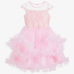 A charming pale yellow tulle dress for girls by Romano, featuring a sparkling sequinned floral bodice with a sheer neckline and appliqué flowers at the waist. Made from soft satin with a tulle overlay and voluminous skirt, it offers a silky lining for extra comfort. The dress fastens with a concealed zip and has a tulle sash that ties in a bow on the back. Limited quantities available, so do not miss your last chance to buy.