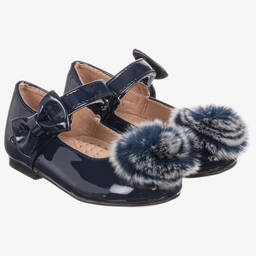Girls patent burgundy shoes by Romano Princess, made in faux leather with a padded instep on the insole. They have a large fur pom-pom on the front and sweet bow on the velcro straps.