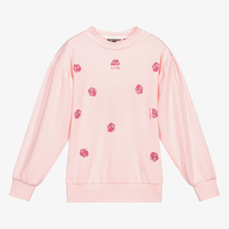 Girls navy blue sweatshirt dress from Rosalita Senoritas. The top half is made in mid-weight cotton jersey and has a colourful logo appliqué on the chest. It has a pink and orange ruffle on the hemline, with a colourful woodlands animal print.