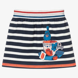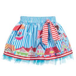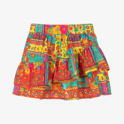 Girls black cotton jersey skirt by Spanish brand Rosalita Senoritas. It has a bold, colourful abstract pattern with flowers and hearts. The glittery blue and silver elasticated waistband adds a lovely touch of sparkle.