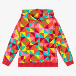 Bright cotton hoodie for girls by Rosalita Senoritas. In shades of pink, blue and orange, this vibrant top has cute manga-style prints, with smiling little girls, whimsical characters and blossoming flowers. Made in soft and stretchy jersey, it features fun mitten-shaped velour front pockets with a matching pale pink cosy velour-lined hood. There are glittery silver striped trims on the sleeves.