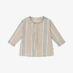 Beige shirt for little boys and girls by 1 + in the family, made in lightweight cotton seersucker. Cool and comfortable, it has a little chest pocket and a small logo tab on the side. This casual, collarless shirt fastens with wooden buttons on the front.