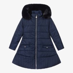 Silky pale blue puffer coat for girls by British brand A Dee, with a pretty ice crystal and logo pattern. Beautifully warm, it has mid-weight padding, with a fixed hood that has a detachable, faux fur trim. The cuffs and hemline are gently elasticated to keep the chilly weather out and the lining is in cosy fleece. A diamanté logo badge glitters on one sleeve and there is a sweet, fixed bow on the back. There are sparkling diamanté zip fastenings on the front and pockets, with logo heart pull tabs.