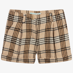 Smart green shorts by Abel & Lula, with a dark red and sparkly gold check. Made in a mid-weight wool blend, they are fully lined in satin and have a useful, adjustable waistband with a gold button and zip fastening.