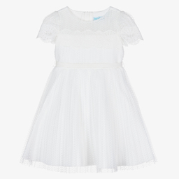 Girls lovely lilac dress from Abel & Lula, made from pleated soft polka dot tulle over white silky satin. It has a sheer panel under the neck with pretty, embroidered lace trims across the chest and on the sheer puffed sleeves. There is a mesh trim attached to the comfortable cotton lining for a fuller skirt. A removable white faux leather belt completes the look.