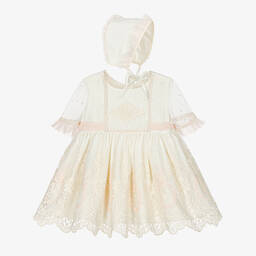 A beautiful mint green floral embroidered dress set for girls by Abuela Tata, made in delicate tulle. It features ivory polka dots, pink floral embroidery, a scalloped lace neckline, and sheer ruffled sleeves for added charm. The dress fastens with pearlescent buttons at the back and a pink sash bow at the waist. Fully lined for comfort, the set includes a matching bonnet with ribbon ties and elasticated knickers. Limited quantities available, last chance to buy.