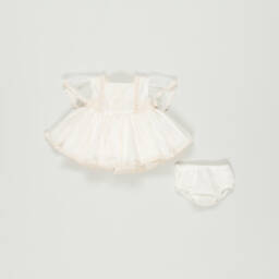 The girls ivory and pink lace set by Abuela Tata is crafted in soft tulle, perfect for a touch of elegance. The dress features delicate ivory embroidery and a lovely dusky pink sash belt, offering both style and comfort. Completing the ensemble are matching bonnet and knickers, ideal for special occasions. With button and tie fastenings, it ensures an easy fit. Limited quantities available, making it a must-have addition to any wardrobe.