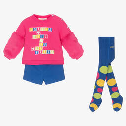 Pretty for baby girls, a pink and green shorts set by Agatha Ruiz de la Prada. The soft velour top has eye-catching 3D flowers on the front and gently elasticated cuffs, with a small logo label on one sleeve and love-heart logo poppers on the back. Made in brushed cotton jersey for a cosy feel, the ruffled shorts are elasticated around the waist and legs for comfort. Completing this girly outfit is a pair of coordinating green socks.