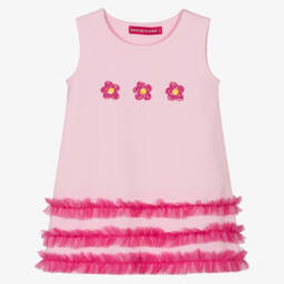 An eye-catching cotton heart pattern dress for girls by Agatha Ruiz de la Prada, crafted from soft jersey. The vibrant top features a geometric heart design with yellow and green accents, complemented by ribbed trims. The Navy Blue pleated skirt has a pink heart logo charm near the hemline. Easy to wear, it pulls on effortlessly, making it suitable for everyday adventures. Limited quantities available, act fast to secure this colourful piece.