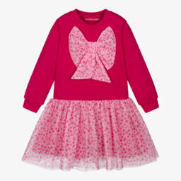 Girls green dress by Agatha Ruiz de la Prada features a vibrant floral design. Made in soft cotton blend jersey, it has long sleeves and charming pink ruffle trims. The gathered skirt adds a playful touch and it fastens neatly at the back with a single button.