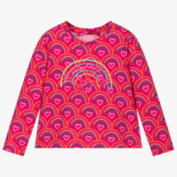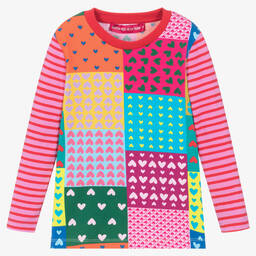 Fun, bright orange viscose top for girls by Agatha Ruiz de la Prada. It has a shimmering, sequinned yellow sun on the front, with an embroidered logo. Just right for relaxed days, it is made in beautifully soft, comfortable jersey.