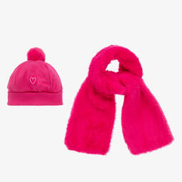 Scarlet hat and scarf set for girls by Agatha Ruiz de la Prada. The hat, crafted from a soft cotton-blend jersey, features a charming heart logo and a playful faux fur pom-pom. Paired with a matching faux fur scarf, it promises warmth and comfort for little necks. Limited quantities available, so don't miss the chance to add this cosy duo to your collection.