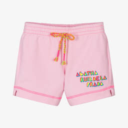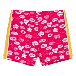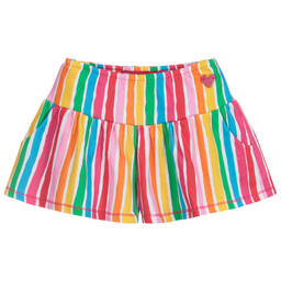Girls white and green cotton fruit shorts by Agatha Ruiz de la Prada feature a vibrant tropical fruit pattern in pink, orange, and yellow, perfect for warm, summery days. Crafted from comfortable jersey, the shorts have a stretchy, elasticated waistband with pretty gathers below and practical side pockets. Limited quantities available, so it's your last chance to buy these delightful shorts.