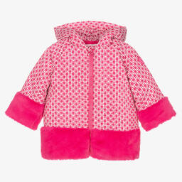 Mustard yellow coat for girls, by Agatha Ruiz de la Prada. Made from soft faux fur, it has two pink sequin flowers on the front over the popper fastenings and concealed side seam pockets. It has a lovely pink silky satin lining.