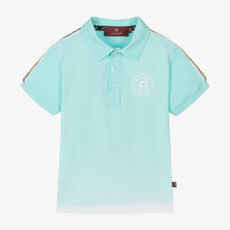 Baby boys yellow polo shirt by AIGNER, made in soft cotton jersey with a subtle ombré effect on the front. The designer's signature 'A' horseshoe logo is printed on the chest in white, with colourful palm tree logo tape down the sleeves. It fastens with branded buttons and has a small logo tab sewn on the side.