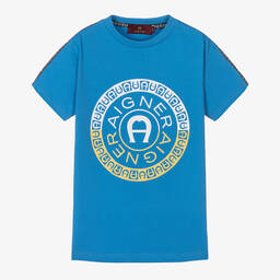 Casual black T-shirt for boys, by German brand AIGNER. Made in soft cotton jersey, it has the brand's signature 'A' horseshoe logo printed on the front in blue and yellow for a recognisable look. With a relaxed crew neckline, it has sporty black logo taping on the shoulders.
