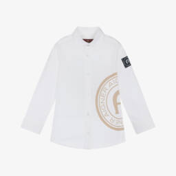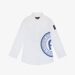 Boys white poplin shirt by AIGNER features a soft and lightweight feel, perfect for the spring and summer seasons. This stylish shirt is adorned with a bold beige logo print showcasing the signature 'A' horseshoe motif, complemented by a branded patch on the sleeve. Fastened with branded buttons at the front and cuffs, it adds a touch of sophistication to any outfit. Limited quantities available, making it a must-have addition to a junior boy's wardrobe.
