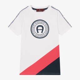 Boys white T-shirt by AIGNER offers a stylish touch with its signature navy blue 'A' horseshoe logo and contrasting red and navy stripe on the front. Crafted from soft cotton jersey, the T-shirt is both comfortable and breathable, perfect for spring and summer wear. The logo taping on the sleeves adds a unique flair. Ideal for casual outings or pairing with shorts for a day out. Limited quantities available, ensuring a unique addition to any wardrobe.