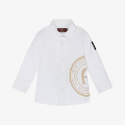 A white shirt with an oversized blue logo is crafted by AIGNER for baby boys. This soft and lightweight cotton poplin shirt features branded buttons on the front and cuffs, offering a touch of elegance. The shirt boasts a striking blue signature 'A' horseshoe logo print, along with a branded patch on one sleeve, for added designer flair. Ideal for spring and summer, this stylish piece is perfect for special occasions or everyday wear. Limited quantities available, so don't miss out.