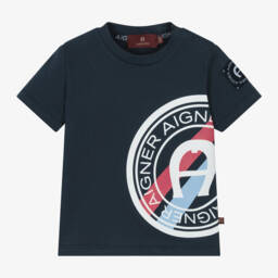 This baby boys blue cotton T-shirt by AIGNER features a striking circular 'A' horseshoe logo on the front, accented with red and blue stripes. Crafted from a soft jersey fabric, it includes convenient popper fastenings on the shoulder, ensuring quick and easy dressing. Ideal for casual outings, this piece combines comfort and style effortlessly. Limited quantities available, making it a last chance to buy for the upcoming spring and summer seasons.