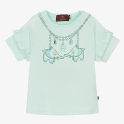 Light pink T-shirt for little girls by German designer AIGNER, made in soft and stretchy cotton jersey. Designed to look like a necklace, this top has a pink chain print, patterned with cute ombré elephants and the brand's signature 'A' horseshoe logo. Frill trims on the sleeves add a pretty finish and there are easy popper fastenings on one shoulder.