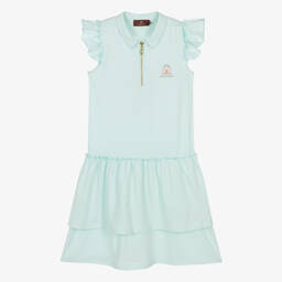 Teen girls pink cotton polo dress by AIGNER features a charming pastel pink shade with a blue handbag logo motif on the bodice. This delightful polo-style dress has a pointed collar, girly ruffle sleeves, and a chunky gold zip fastening at the front. The dropped waist skirt adds a relaxed yet feminine silhouette, perfect for casual outings or special occasions. Limited quantities available, last chance to buy this exquisite piece.
