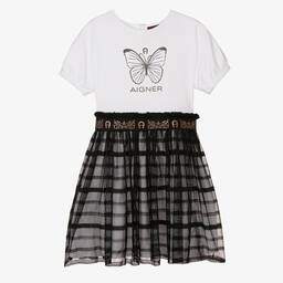 White and pink T-shirt dress for teen girls by AIGNER, featuring a sparkly butterfly graphic and the brand's signature 'A' horseshoe logo on the front. Designed for a two-in-one silhouette, the cotton jersey bodice has elasticated cuffs, a casual round neckline and button fastenings on the back. The cotton skirt has a pink stretchy mesh overlay, complete with a rose gold logo band that cinches at the waist.