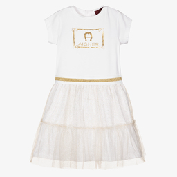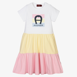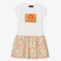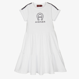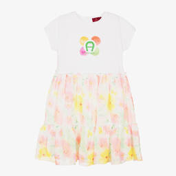 White with a colourful floral pattern, this pretty dress for teen girls is by AIGNER. Easy and comfortable to wear, the bodice is made in soft cotton jersey with ruffle trims, and the gathered skirt is in lightweight voile and fully lined. There is a floral motif on the chest, with the brand's signature 'A' horseshoe logo in the centre. Adding a finishing designer touch, the dress fastens with branded buttons on the back.