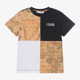 A boys blue cotton geo map T-shirt by Alviero Martini features a stylish colourblock design with the iconic pale blue Geo map pattern and a white 1a Classe logo print on the chest. Made from soft cotton jersey, it has a lightly ribbed crew neck and short sleeves, perfect for everyday casual wear. Last chance to buy this unique piece with limited quantities available.